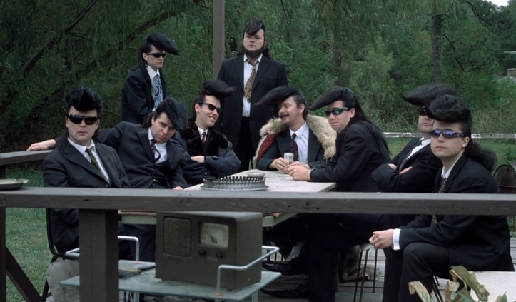But there’s more. See, for no reason ever explained (the film is like that) the entire band is… uhh… themed? They all have improbably large, pointy black quiffs, and they all wear improbably long and pointy black shoes, and they perform in black suits. Yep. So — visually, putting these guys up in front of crowds of everyday Americans in places like Tennessee and Texas is fairly hilarious.