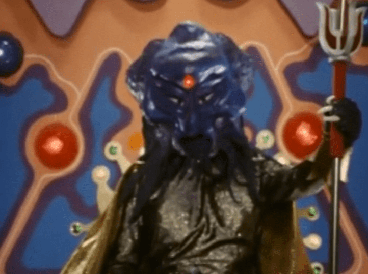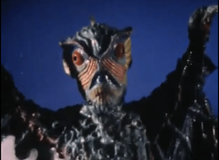 First: Yeah, I was right. The kid and his Flying Robot are fighting giant monsters brought to destroy human civilisation so an alien named Emperor Guillotine (whose outfit is so completely pants that I can’t tell whether the shiny blue lump of ugliness atop his shoulders is meant to be his alien head, or some kind of cheap mask) can take over. Emperor Guillotine, who arrives on earth for Ep 1 in what the narration calls “a weird UFO” hangs out on the bottom of the ocean, sending orders to his minions the Gargoyle Gang by way of video link. (Far out, Daddy-o! Futuristic technology!)