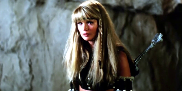 But what we get is the less-exciting aftermath, where the grumpy guys — looking like knock-off Vikings — return to slaughter or capture all of the women. The only survivor of the tribe’s massacre is Hundra (Laurene Landon), their greatest warrior and fashion model. She gets some revenge, sure, but she also feels compelled to find a man to get pregnant and start up her own tribe.