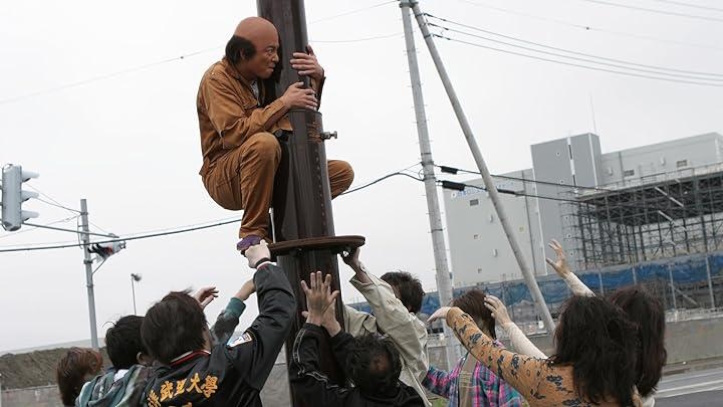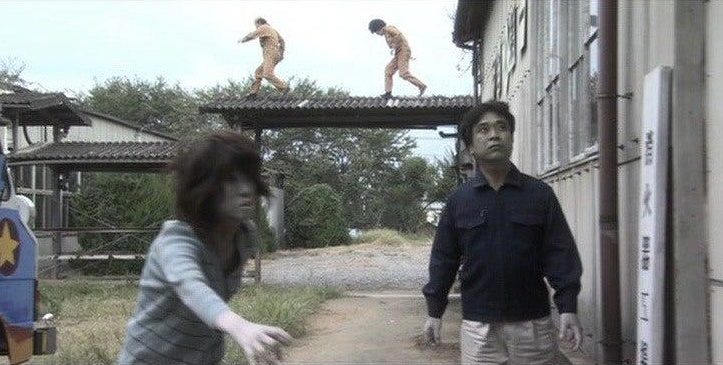 The film starts off with Fujio (Asano) and Mitsuo (Aikawa) working in a fire extinguisher factory. They’re not really working though; they are kind of just messing around and wrestling. Fujio and Mitsuo are a solid mix between Crosby and Hope with some Cheech and Chong mixed in. As they’re messing around, the boss confronts both of them and forces Mitsuo to roll up in a mat so he can smack him to humiliate him even further. Fujio doesn’t appreciate this, though, and grabs an empty fire extinguisher and smacks the boss in the back of his head, killing him. This right here sets the exact tone of the movie. These two don’t care.