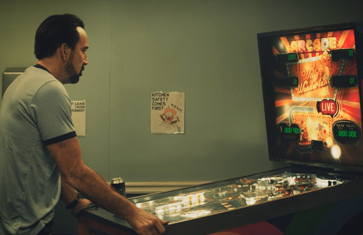 And then Cage changes his shirt and starts conscientiously cleaning up again, until the next attack. And occasionally he takes a break to indulge in pinball and slam energy drinks. That’s the extent of his characterization, though. If you’re looking for answers as to how and why he’s able to destroy mechanized terrors while being patently unfazed by their very existence, you’re going to have to supply them yourself. Willy’s Wonderland is far more interested in breaking stuff than building it.