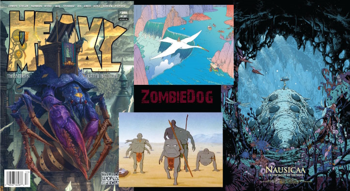 Left: Heavy Metal magazine cover. Right: Movie poster for Nausicaä of the Valley of the Wind. Center Top: Mobius print. Center Bottom: Movie frame from Gandhar