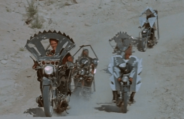 Seriously, though, this is one of the least intimidating gangs in the annals of post-apocalyptic movies. Riding motorcycles outfitted with so much extraneous production design that they’re noticeably hard to steer and sporting leather and studs stolen from Rob Halford’s wardrobe, they slowly tool around the wasteland looking to victimize those who can’t outrun their ridiculous bikes. Not exactly a forbidding lot here.