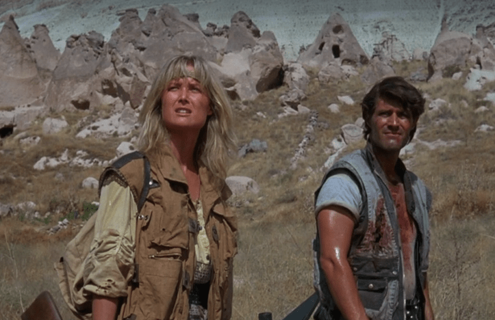 Land of Doom isn’t the worst of these movies. Honestly, it’s not even close to being at the bottom of the post-apocalyptic barrel. That doesn’t mean it’s exactly good, but to the movie’s credit it at least plays with the genre a bit and attempts to add a few new elements to the mix, including building the film around a female lead. Harmony (Deborah Rennard, Lionheart) is an understandably anti-social survivor in a post-nuclear war wasteland. Skulking through the wreckage and evading leather-clad raiders, Harmony comes across a wounded Anderson (Garrick Dowhen). Although she’s intent on remaining a loner, the two nonetheless end up traveling together through the desert wastes with scenic Cappadocia, Turkey acting as a suitable stand-in for the Australian Outback.