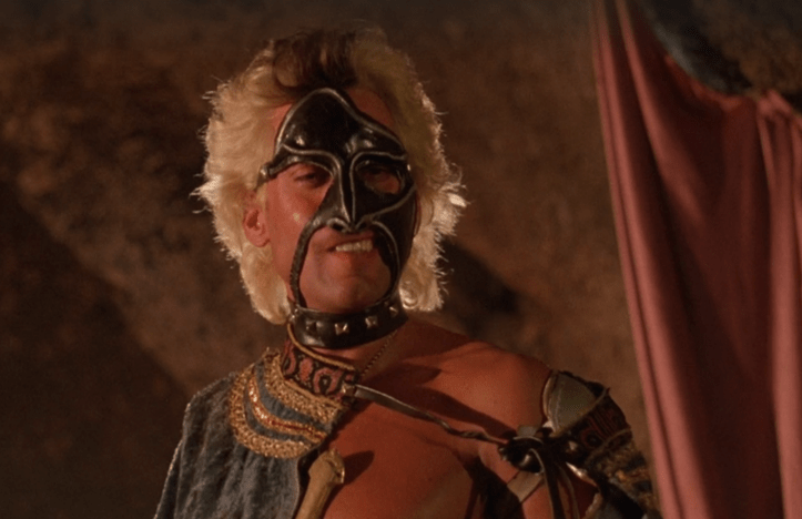 Ah, Slater. No doubt meant to be a menacing figure with a mask covering half of his face, Slater is less a Lord Humungus-style threat and more what you would think the lead singer for a Manowar cover band might look like. Slater tries to menace our heroes, but even they aren’t buying his tough guy act, and things quickly go south for the raiders when Orland shows up to the party packing a flamethrower. And that’s when the pyrotechnics crew on Land of Doom really get to cut loose and happily blow up everything. Motorcycles, fuel barrels and rock formations all explode in a joyous frenzy of destruction as our heroic trio take down Slater’s crew with abandon.