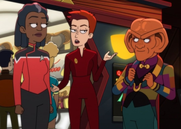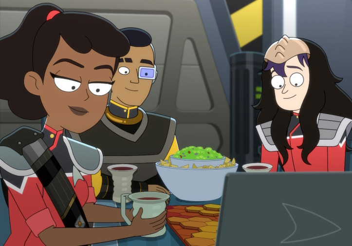 Things are grim at the start of Season 3: Captain Freeman is under arrest for the alleged bombing of the Pakled planet and the Cerritos is impounded. A bold rescue plan by Freeman’s daughter Beckett and her fellow “lower deckers” is almost instantly subverted as the justice system prevails and rash ship-stealing is condemned. This first episode is a good reminder that the makers of Lower Decks know Trek just as well (if not more) than you do and are going to use your familiarity and expectations against you.
