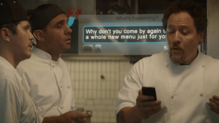 In Chef, high-end chef Carl Casper, divorced from a woman he still loves (Sofia Vergara, because why not) and father to a son he can’t find time to raise, comes up to an important milestone in his career: The fancy restaurant whose kitchen he leads will be reviewed by the most infamous food critic in the land (named, curiously enough, “Ramsey,” and played by Oliver Platt). Things do not go down well. Being torn apart by words is only the beginning of his end. Next he’ll discover Twitter, and take his meltdown viral.