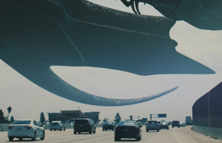 - And now there’s a yuuuuge CG spaceship hovering over the city, which shoots laser beams at the freeway. Something every L.A. commuter probably dreams of doing.