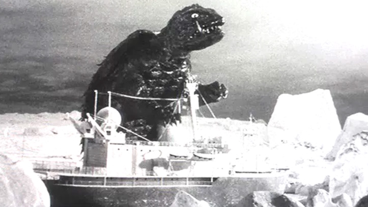 A model of an American jet shoots down a model of an unidentified bomber over Alaska, causing the cutest nuclear explosion ever. Out of this snowy crater emerges a giant screeching turtle — GAMMERA! Why there was a turtle hanging out in the snow near an Eskimo village in Alaska is not adequately explained, so I’ll trust that internet fanfic has filled in that gap with a story about an exotic pets trader who was trying to create a new sales route in the north.