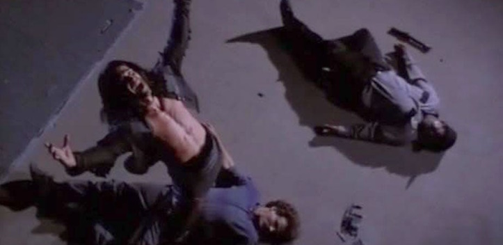 I know that Don Wilson has a devoted following, which has to be for his flexing and martial arts ability alone. This must be the case, for he is — and I say this without any rancor — a laughably bad actor. He’s so terrible that I kept thinking I was watching a parody. Every scene where he has to spit out some tropish dialogue or summon up a basic human emotion, I was tapping my foot and muttering, “Get to the spin kicking already! Can’t you kick that coffee cup off the counter? Just to tide me over?”