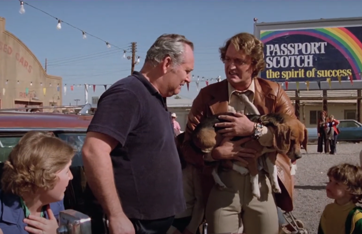 Aiding and abetting Rudy in his schemes are fellow salesman Jeff (Gerrit Graham, Phantom of the Paradise) and the shop mechanic Jim (Frank McRae, 1941). And also Toby the dog, who plays dead so well that a family is guilted into buying a station wagon after they think they’re run him over.