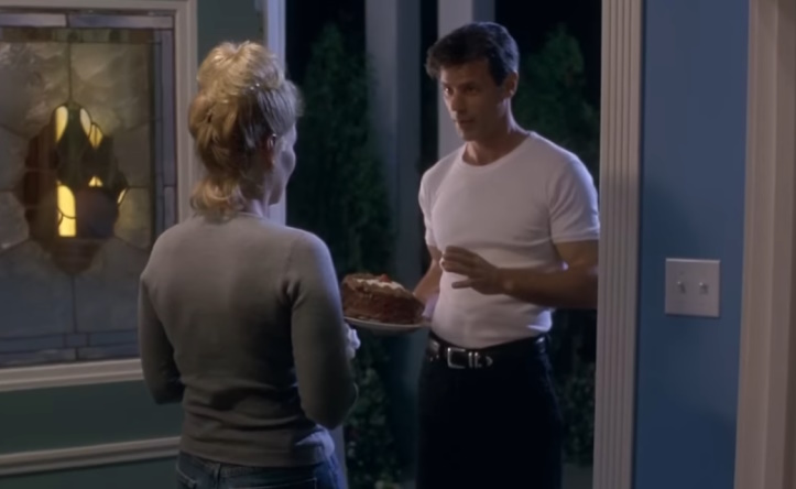 There are a few subplots happening as this goes along. Growing Pain’s Alan Thicke wanders into a few scenes as a rival sportscaster, hamming it up as a guy who got an easy paycheck and isn’t that concerned about quality control. Molly’s daughter Sarah shows that she’s both an ongoing fashion disaster and is inexplicably attracted to her complete jerk of a step-brother. Sam, the step-brother, makes me want to yank him out of frame by his Backstreet Boys haircut and give him a dressing down. And, naturally, the newlyweds stew in jealousy at their exes’ newfound romance.