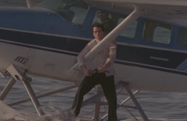 And unfortunately, that’s about half of the movie. Now the cast here is actually pretty good, which keeps Out of Control from just falling apart at this point. We’ve got Betsy Russell of Tomboy fame, Sherilyn Fenn just a year before her co-starring role in The Wraith, and Jim Youngs, who was last seen losing in a game of tractor chicken to Kevin Bacon in Footloose. And it’s the latter actor, as Cowboy, who takes the lead spot as the film goes on, saving the others from the drug smugglers who come sailing up to the island one day and finally getting the plot rolling along.
