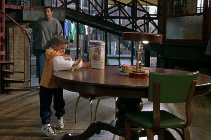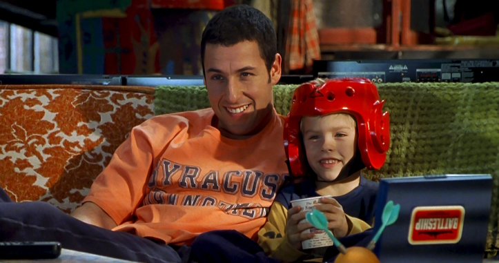 Sonny (Sandler) is a NYC slacker who’s coasting off the settlement from a car accident instead of passing his bar and becoming a lawyer. Fearing that his lack of ambition and responsibility is driving his girlfriend Vanessa away (spoiler: it is), Sonny leaps at the opportunity to “adopt” a five-year-old kid named Julian. This convoluted premise is made possibly only because the mother abandons him to Sonny’s roommate father (John Stewart) while his roomie is out of the country for an extended period of time.