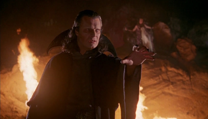 The wizard*, Mestema (Night Court’s Richard Moll), thinks that he’s found a worthy opponent in Paul.** So he kidnaps Paul’s girlfriend Gwen (Leslie Wing) and challenges the hacker to a dungeon run with Gwen as the prize. While Paul’s navigating these dangers, Gwen gets to hang out without any pants and chained to a rock for the duration. She probably hated her agent after this film.