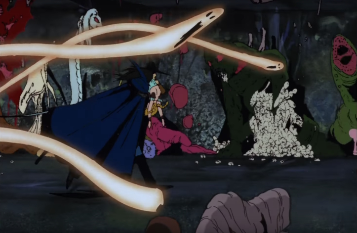 Each character of Vampire Hunter D looks distinctive but possesses a single personality trait… at most. The dialogue swings wildly from cringy to cliché to bizarre. Major plot and character moments are never explained, like why D’s left hand has a super-powered extra face that talks to him, or why Doris doesn’t own any pants. It’s windy in this town!