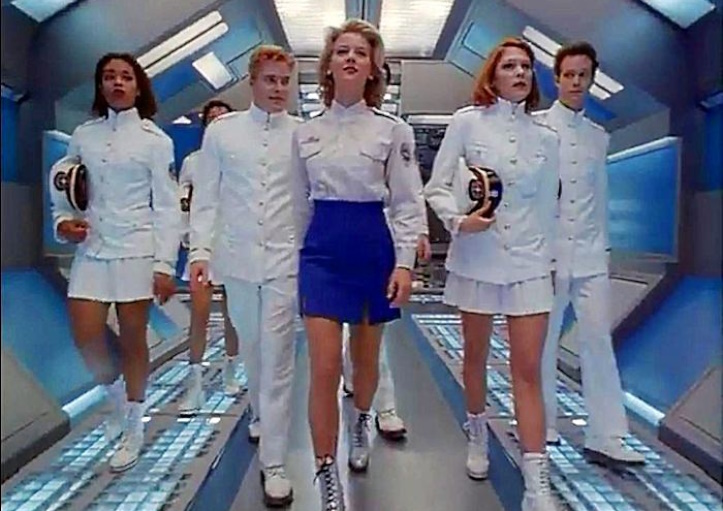 Just in case you find yourself at a loss as to who the good and bad guys are, Star Command graciously helps by color-coding uniforms. If the people are wearing black, they’re evil space Nazis. If the people are wearing the most blinding white this side of stormtroopers, they’re the virtuous space heroes. And if they’re wearing skimpy miniskirts, they’re female actors hired to be eye candy.**
