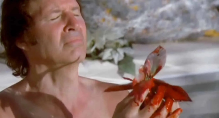 - When your fiance is murdered by an assassin’s bullet, cry out once and then let her float away, face-down, in a pool while you float next to her and give the audience a look at your private parts.