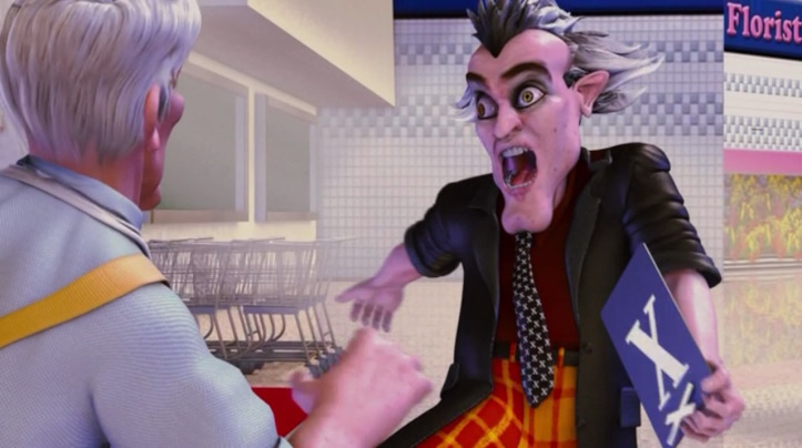 Christopher Lloyd plays Mr. Clipboard, an absolutely terrifying goosestepping, eye-bulging sales Brand X robot that would’ve scarred kids for life if any kids actually saw this. In a movie brimming with every animation “don’t,” this character stands out as its greatest sin and most likely to leave my eye twitching for the next week. (Second to Mr. Clipboard is “every human customer” in the supermarket, which are also grotesque in their own way.)