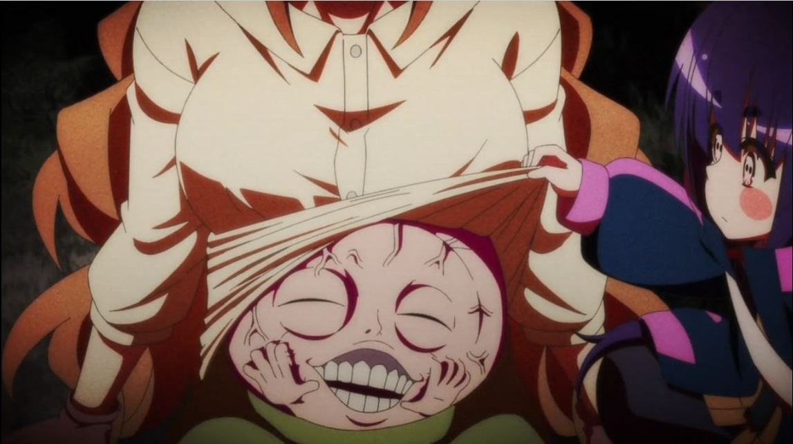 With this revised plan, the team goes from visiting random haunted sites to seeking out the worst of the worst to provide Yayoi with a truly nightmarish roster of spooks to take on Taisai Seikun and deliver on her promise to make him her slitch. While in practice this isn’t too different from the prior Monster of the Week format, the spooks they encounter are tougher, the stakes are higher, and the confrontations last over multiple episodes while going all in on the Pokémon-style rumbles. Plus there are more instances of freakish abominations popping up from behind.