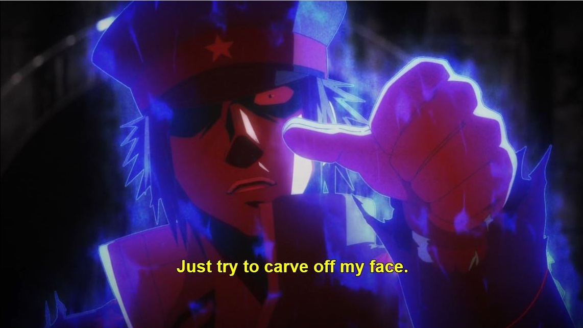 By drawing someone in his sketchbook and then scribbling it out, the target’s body mass is destroyed and converted into meatballs, which he then consumes to empower himself. This attack is graphically demonstrated on the spiritualist. While Yayoi et al possess proxy dolls that can take damage for them, these are a finite resource.
