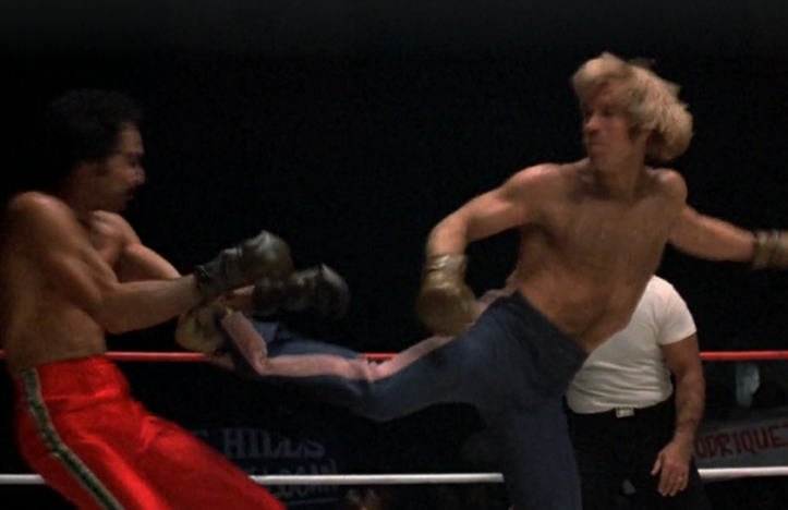 That of course brings them to martial arts trainer Matt Logan (Norris, Invasion USA), who not only runs a dōjō but is in training himself for a big championship match. Which of course means we get an extra dose of karate goodness in A Force of One, as Logan gets in the ring for a fight and then later watches the man he’ll soon be facing, Jerry Sparks (fellow martial arts legend “Superfoot” Bill Wallace), as he dispatches an opponent as well.