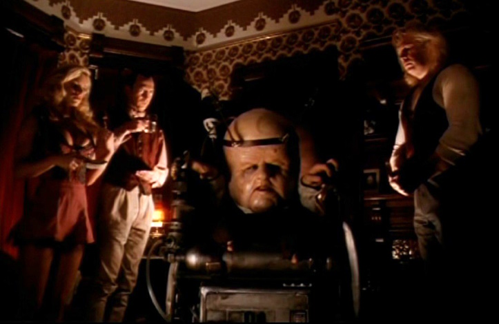 Today’s thespian masterpiece is Head of the Family, a film that might boast one of the strangest premises of all of Full Moon’s library. It has to do with a really odd family called the Stackpooles — a foursome of mutants who each have a superpower of sorts. There’s Otis, the super-strong one; Ernestina, the super-attractive one; Wheeler, the one with super-senses; and Myron, the super-intelligent one. Myron is the titular head in more ways than one (precisely, two) — he’s the leader who telepathically controls the others, and he happens to be little more than a giant noggin on a wheelchair with little arms.