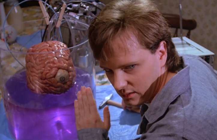 Which is not to say that Frankenhooker is totally without antics. After all, a young woman being dismembered by a remote-controlled lawnmower is certainly a grotesque way to kick off a movie. But young Elizabeth (Patty Mullen, Doom Asylum) is more fortunate than most in her situation, as her boyfriend Jeffrey Franken (James Lorinz, Robocop 3) is something of a mad scientist. Not an official one, of course, as he’s been kicked out of three medical schools, but he’s still a talented hobbyist with a laboratory in the basement of his mother’s house, and he’s determined to piece together Elizabeth no matter what.