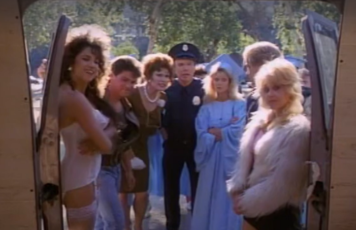 The story, such as it is, covers the going-on at a police vice academy, which is evidently a thing in this cinematic world. Linnea Quigley (Hollywood Chainsaw Hookers) is Didi, the Steve Gutenberg-ian lovable goof who leads the other goofs as they bumble their way through the movie. Her nemesis is the police captain’s daughter, Holly (Ginger Lynn, trying to carve out a career in non-adult films), the teacher’s pet who can do no wrong. As they compete to make the most arrests, antics ensue.